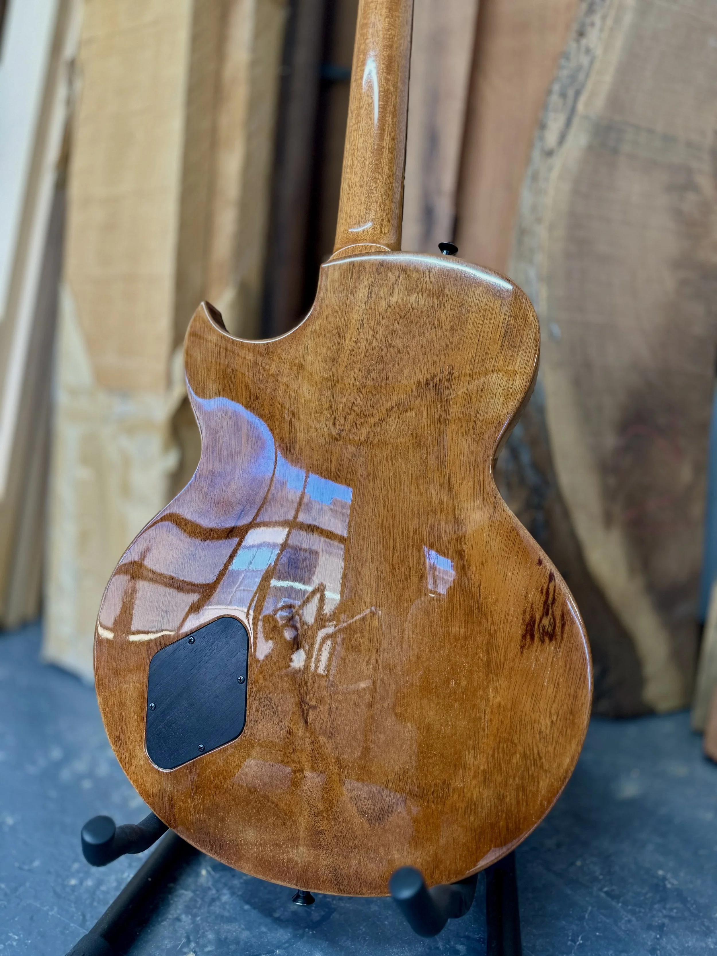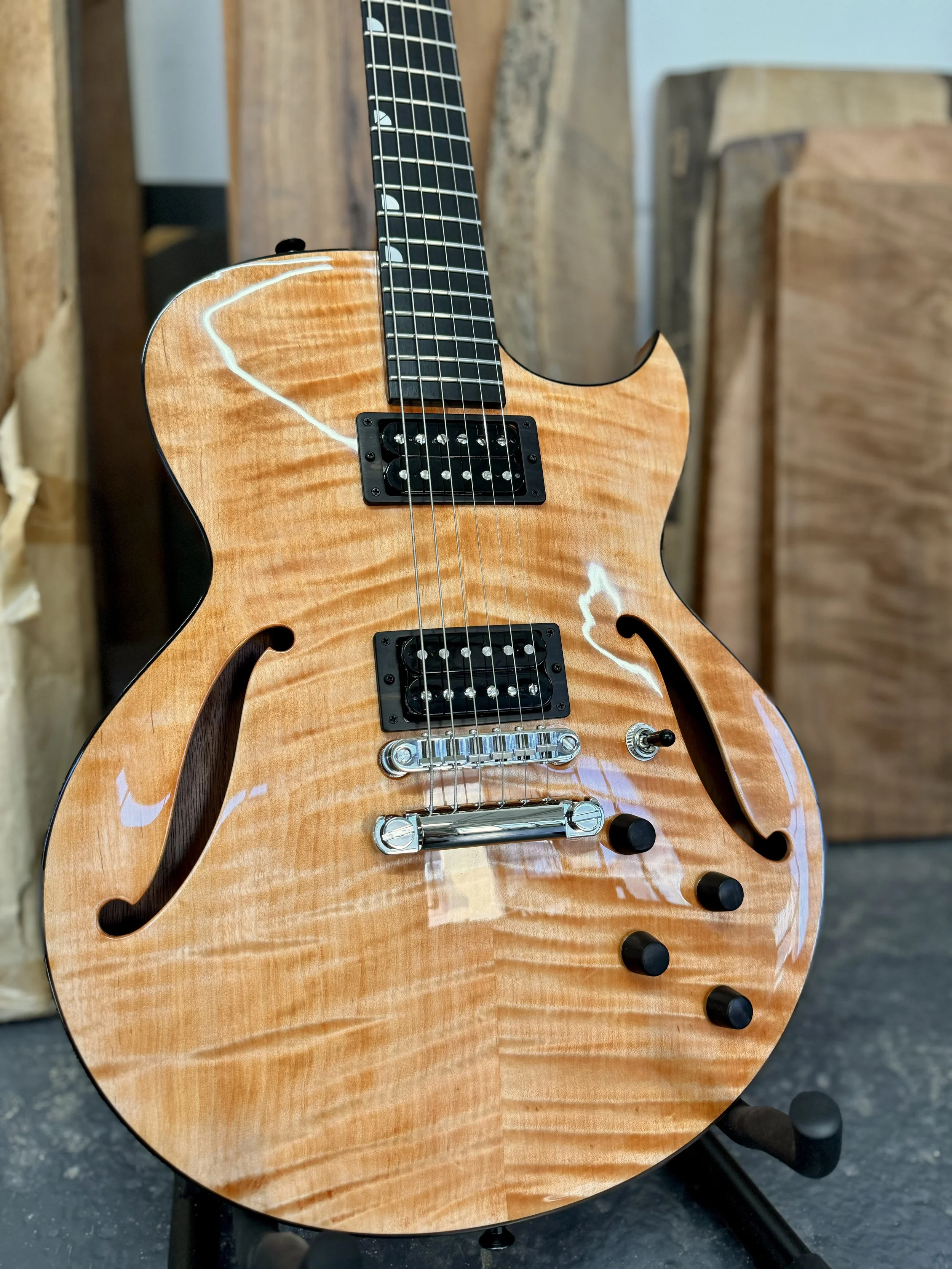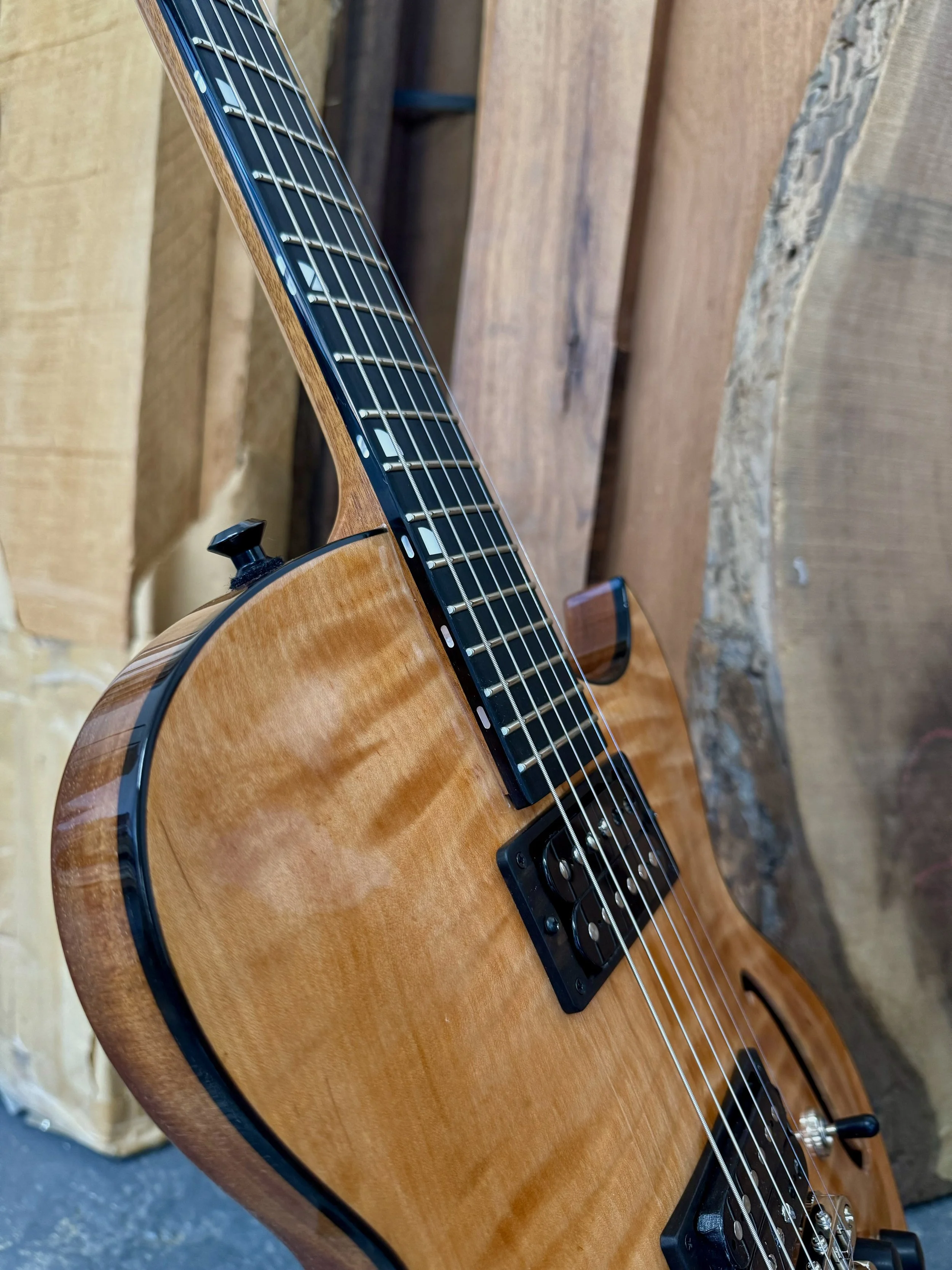 It features a fully chambered mahogany body with a contoured center block extending only to the tailpiece in order to maximize the acoustic space inside the box. The solid flamed-maple top is carved and graduated in the same manner as all my fully acoustic archtops.
